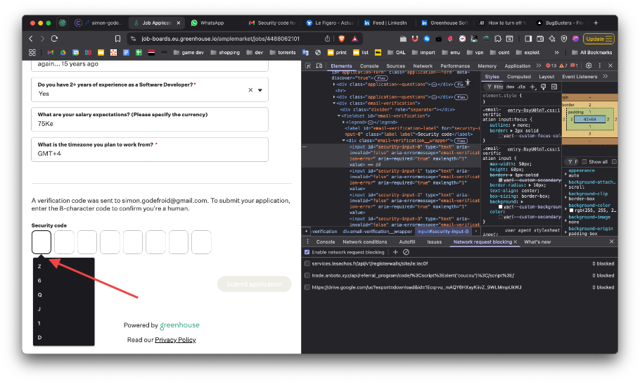 Apply to a job and click on the first input of the security code inputs... Clicking will open the previously entered first characters of former security codes.